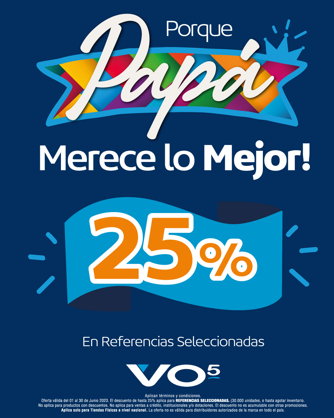 Oferta válida del 01 al 31 de junio de 2023. El descuento de hasta 25% aplica para REFERENCIAS SELECCIONADAS. (30.000 unidades, o hasta agotar inventario). Aplica para todas las formas de pago incluyendo ventas Sistecrédito y Addi, No aplica para productos con descuentos. No aplica para ventas a crédito, institucionales y/o dotaciones. El descuento no es acumulable con otras promociones. Aplica solo para puntos directo de fábrica VO5 en todo el país. La oferta no es válida para distribuidores autorizados de la marca en todo el país.