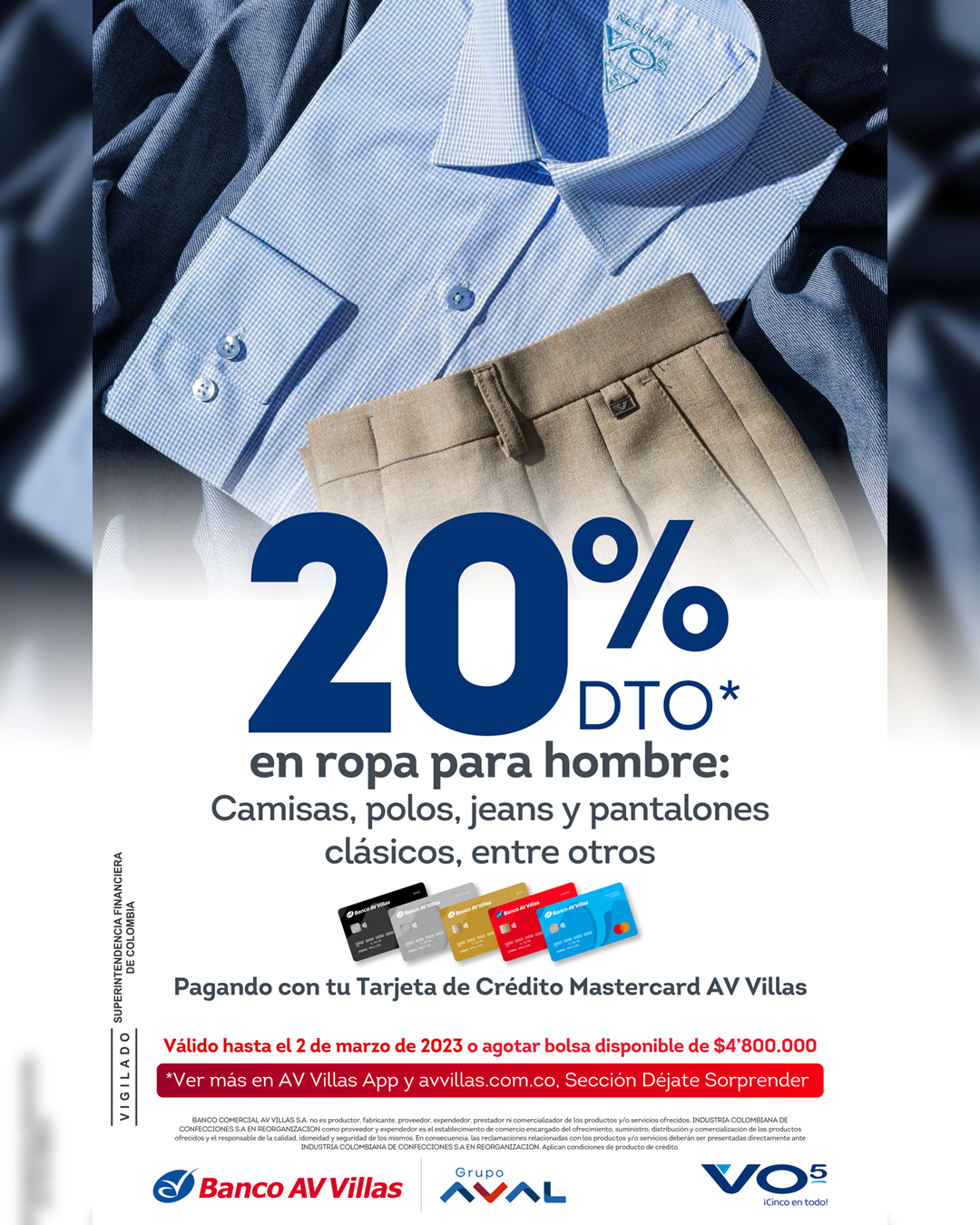 Válido los jueves: Diciembre: 29 de 2022, enero: 5, 12, 19, 26, febrero: 2, 9, 16, 23, marzo: 2 de 2023 o hasta agotar bolsa disponible de $4.800.000. No es acumulable con otras promociones. Descuento solo aplica para tiendas físicas. BANCO COMERCIAL AV VILLAS S.A. no es productor, fabricante, proveedor, expendedor, prestador ni comercializador de los productos y/o servicios ofrecidos. INDUSTRIA COLOMBIANA DE CONFECCIONES S.A EN REORGANIZACION como proveedor y expendedor es el establecimiento de comercio encargado del ofrecimiento, suministro, distribución y comercialización de los productos ofrecidos y el responsable de la calidad, idoneidad y seguridad de los mismos. En consecuencia, las reclamaciones relacionadas con los productos y/o servicios deberán ser presentadas directamente ante INDUSTRIA COLOMBIANA DE CONFECCIONES S.A EN REORGANIZACION. Aplican condiciones de producto de crédito.